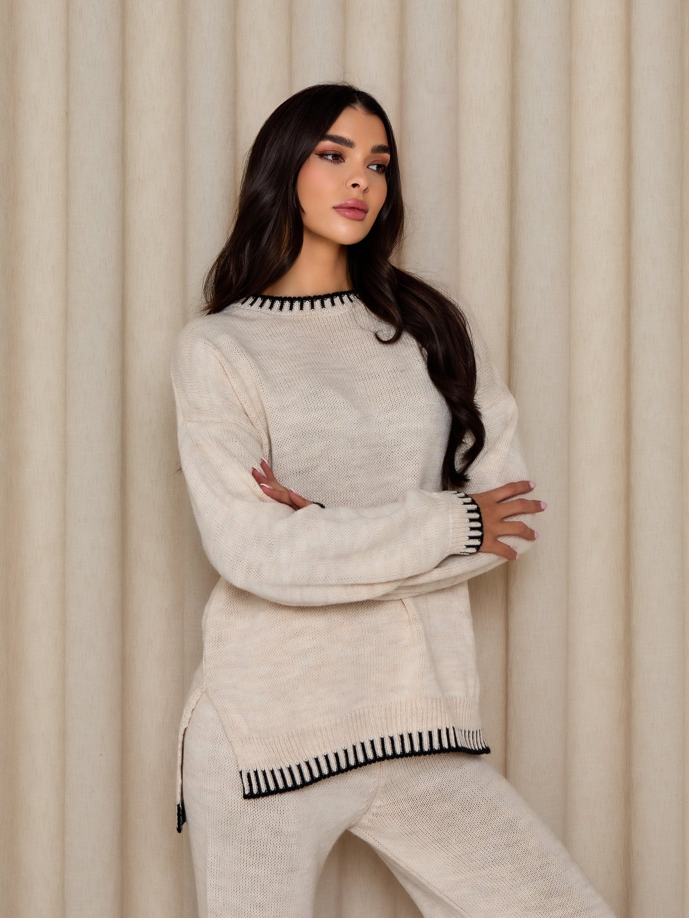 Stay cozy and stylish with this knitted co-ord set in a warm beige tone, perfect for a chic autumn look. Made from thick, high-quality knit material, it provides comfort and warmth for cooler days. Featuring a contrast sweater with playful details and wide-leg trousers with a stretch waistband, it offers an elegant yet relaxed silhouette. Whether at home or out, this set effortlessly blends comfort and sophistication.Two-piece set: This co-ord set offers a versatile outfit that you can wear together or separately. Mix & match for endless styling options!
